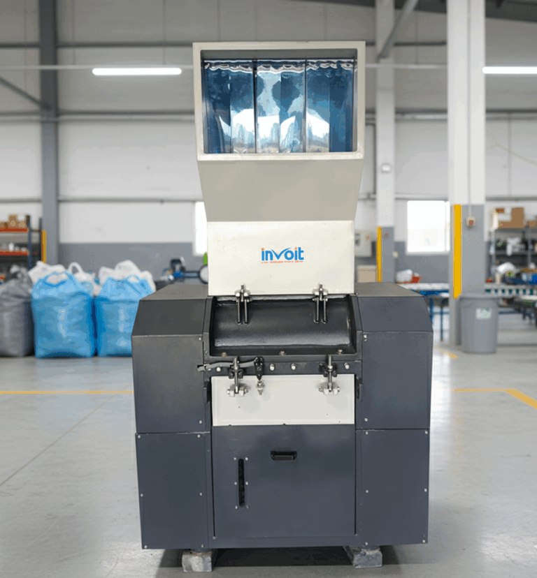 Bulky scrap, such as tank cut-outs or rejected shells, is fed into an oversized, heavy-duty hopper. Invoitplast Machinery PVT LTD designs these hoppers with anti-flyback curtains and acoustic insulation, ensuring both operator safety and significant decibel reduction on the factory floor.